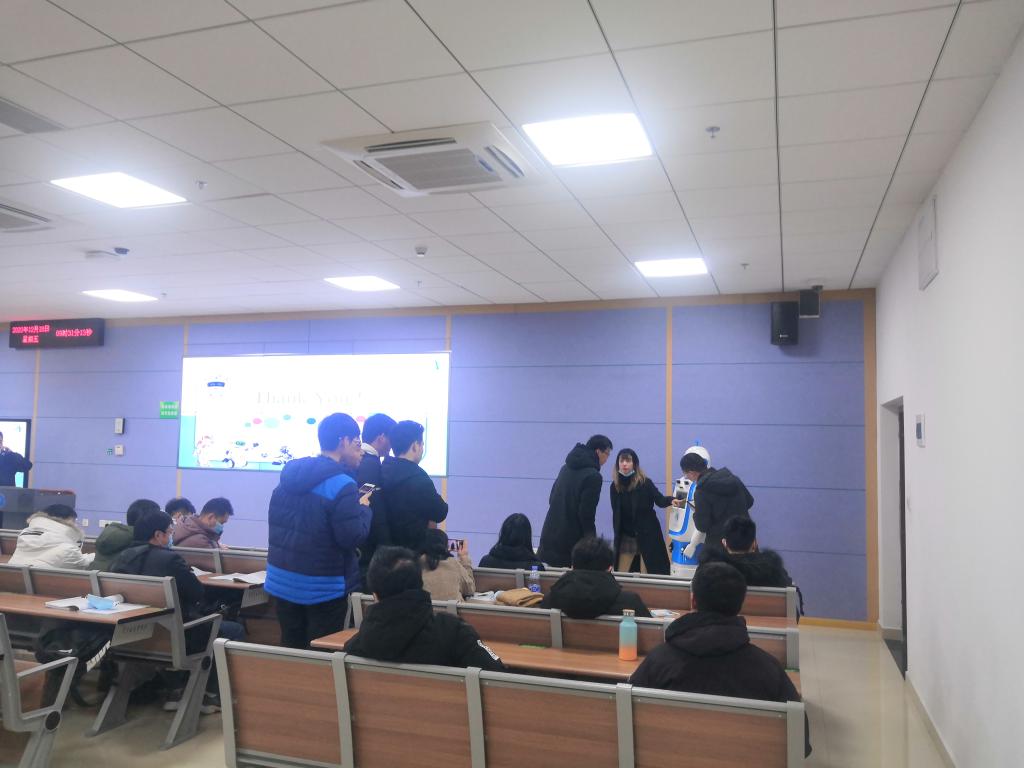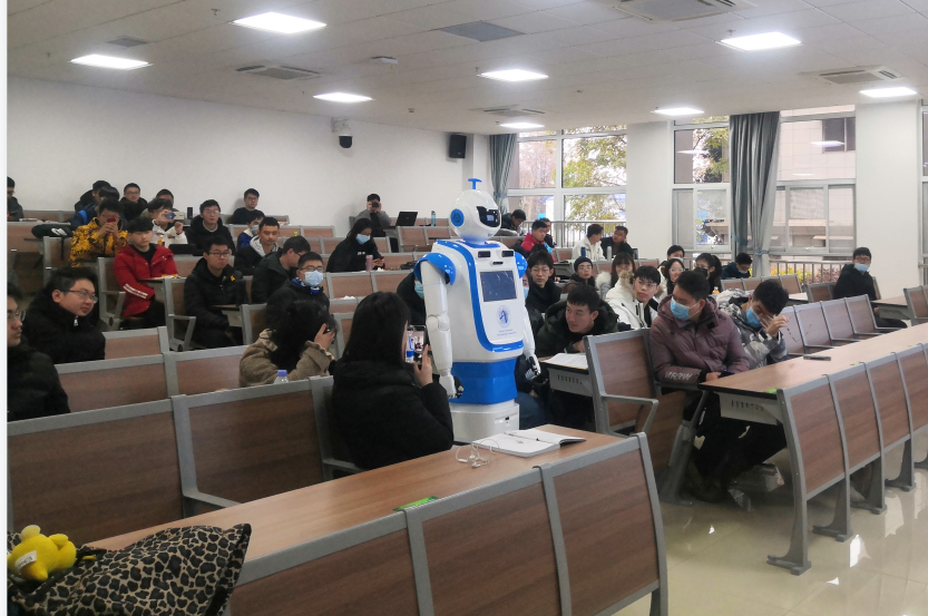 2020年12月18日,在《智能机器人技术》的本科生课堂上,公司情感计算团队研发的情感机器人WEBO(We Robot)首次公开亮相。WEBO一进入教室,就吸引了在场员工的全部注意力。WEBO外观主要由带有地大特色的蓝白色组成,头顶设计了地大标志——地质锤,并且身上还绘制极具标志性的365亚洲体育网入口(武汉)校徽与365best体育官网登录院徽。