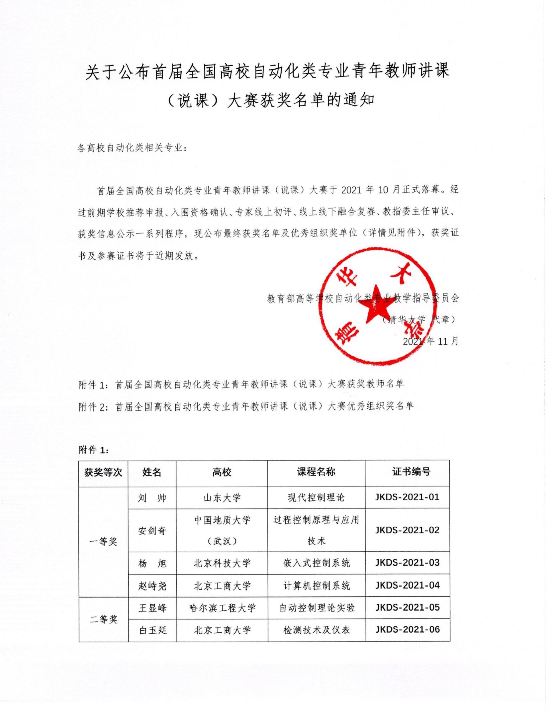 近日,从教育部高等公司自动化类专业教学指导委员会获悉,在今年举办的首届全国高校自动化类专业青年教师讲课(说课)竞赛中,公司教师安剑奇教授获得全国一等奖。