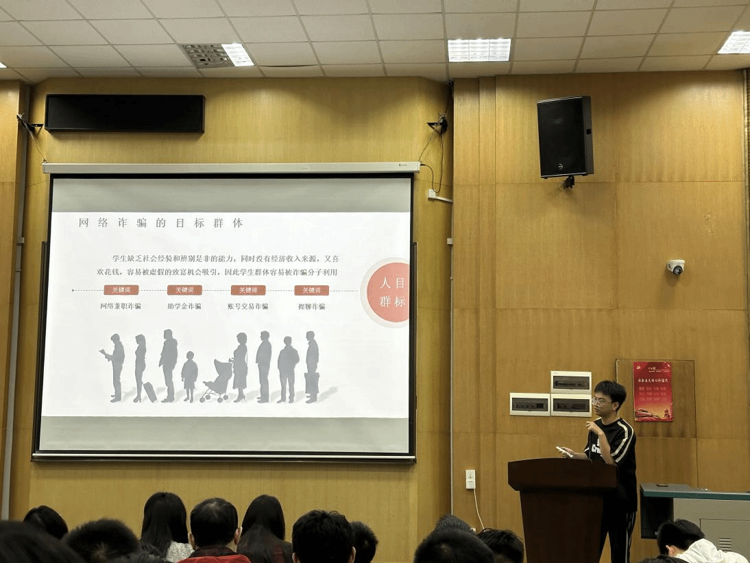 紧接着,兼职辅导员卢卫家开展安全教育,为同学们详细讲解了各类诈骗案例与手段,提醒同学们提高安全防范意识,坚决抵制诱惑、不贪小利,鼓励大家培养健康兴趣爱好,保障生命健康与财产安全。