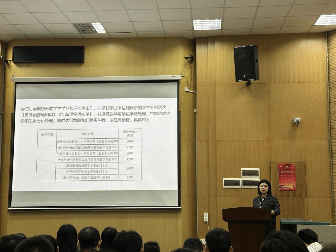 首先孙静老师针对针对请销假制度、课程制度、大三年级重要事项、生涯规划、就业信息等方面进行详细讲解,其次开展学情分析主要介绍,并详细解读了专业培养计划,提醒同学们清晰掌握自身学分情况与毕业条件,明确学业预警制度,并建议大家充分利用本科生导师制度,主动与导师沟通学业困惑。