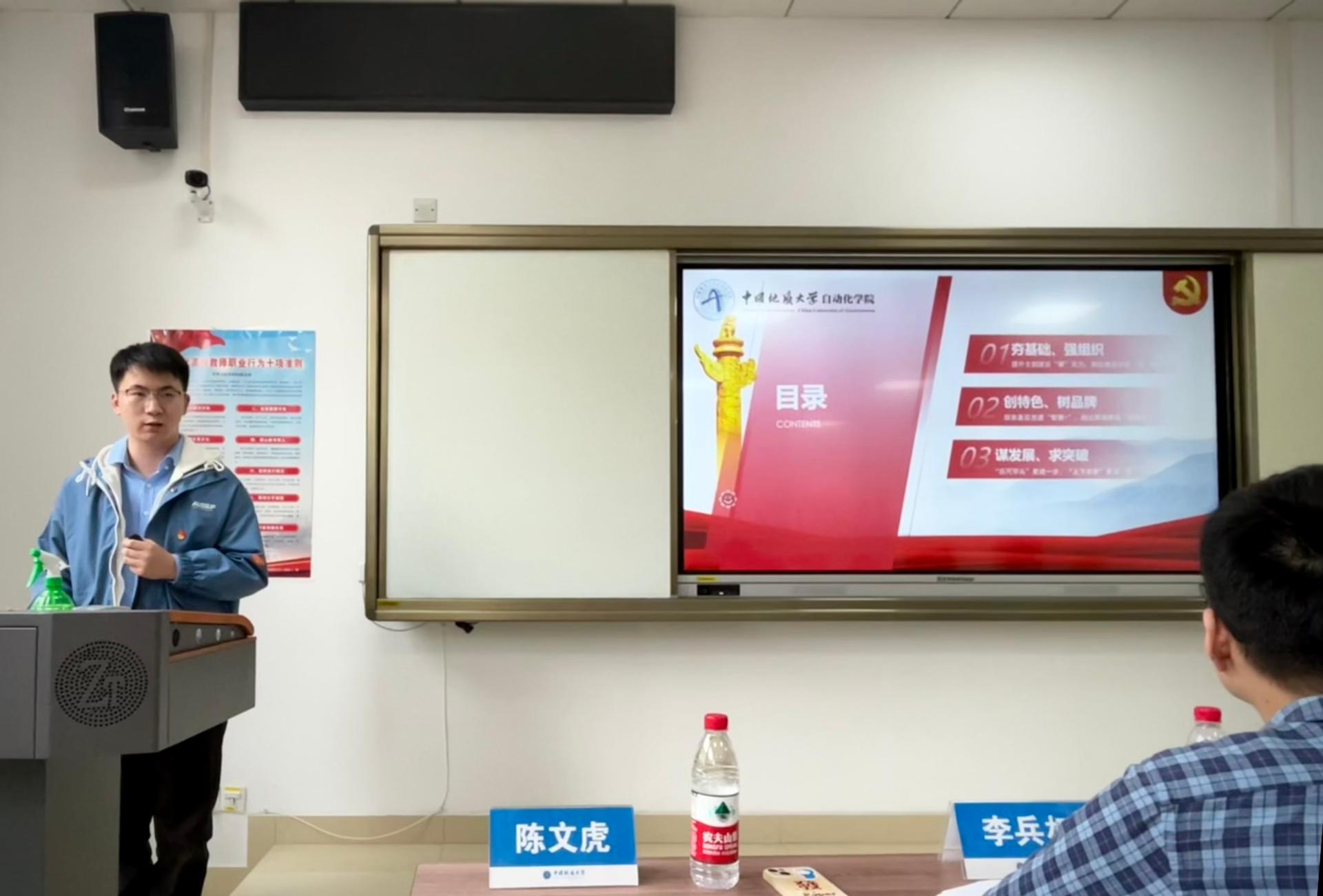 博一党支部书记陈文虎以《融汇‘新工科’专业特色,让支部建设走‘新’更走‘心’》为题,从夯基础、强组织,创特色、树品牌,谋发展、求突破三个方面分享了支部在建设过程中的创新与突破、经验与成就。党支部融合了“创新型和工程应用型的国家化高层次人才”的培养目标,呈现了以“新工科”为专业特色、以“党建+新一代信息技术”为工作品牌的支部样貌,总结介绍了打造“引领型学习型服务型”党支部的具体举措。