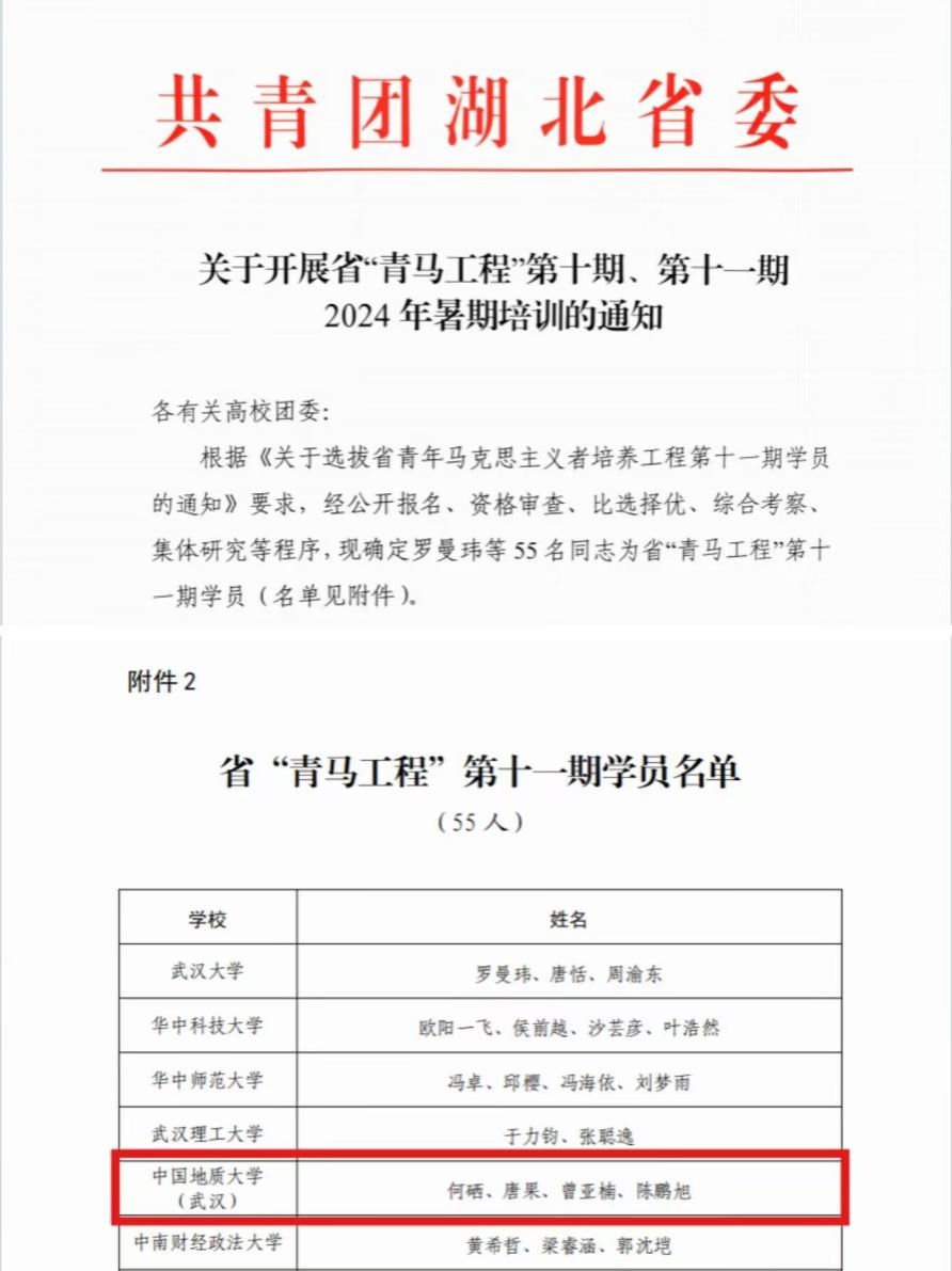 今年5月,共青团湖北省委、湖北省教育厅联合发布《关于选拔省青年马克思主义者培养工程第十一期学员的通知》,从湖北省20所高校中遴选55名老员工作为省“青马工程”第十一期学员。经公开报名、资格审查、比选择优、综合考察、集体研究等程序,公司2022级自动化专业本科生陈鹏旭同学成功入选!