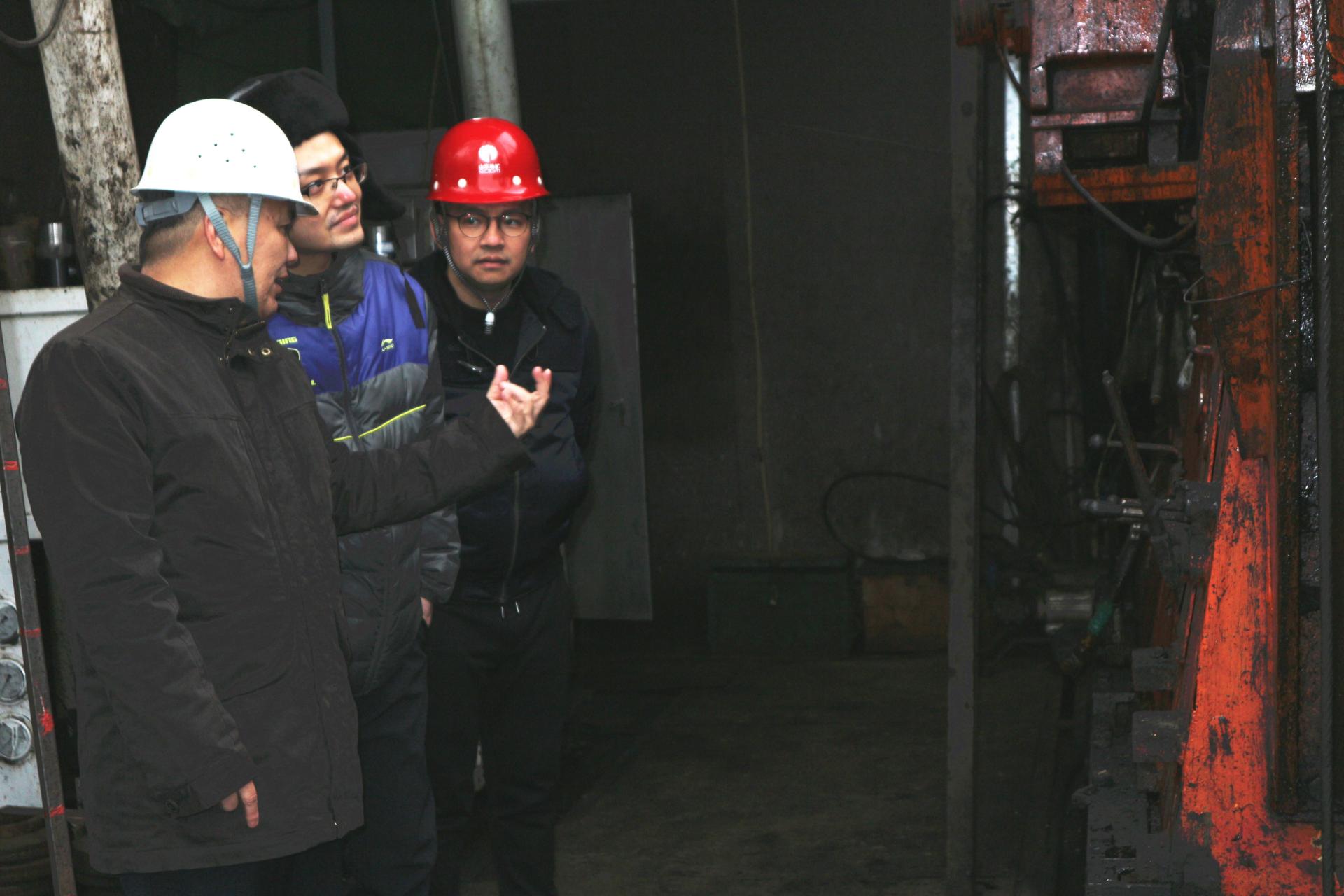 随后,吴敏教授一行赴辽宁丹东,到东北非煤固体矿产钻探第一深孔施工现场展开调研,考察公司智能钻进控制系统的应用情况,看望了驻守在工地开展工程应用的研究生同学。