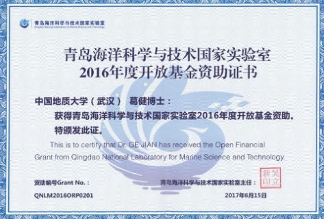 国土资源科学技术奖 青岛海洋科学与技术国家实验室开发基金资助证书